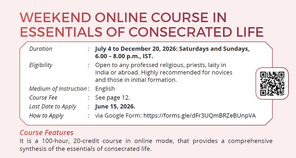 It is 100 hours week-end distance learning certificate course for deeper commitment and renewal of consecrated persons. It deals with the re-visioning consecrated life in dialogue with its past, universal heritage and contemporary relevance within the Asian and, particularly, Indian context. It empowers the consecrated persons to harmoniously integrate their call within the demands of consecrated life, and there by to endow them with greater theological, biblical, and anthropological learning to face the challenges of the secular and modern society so that they could become the leaven, light, and salt, contributing effectively to the mission of the Church. All the essential elements of consecrated life are covered with fourteen courses. Students are free to do all the courses or only selected courses. You can apply through the google form attached.